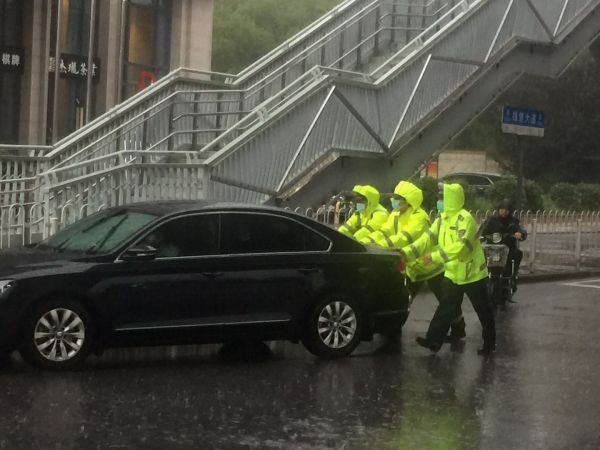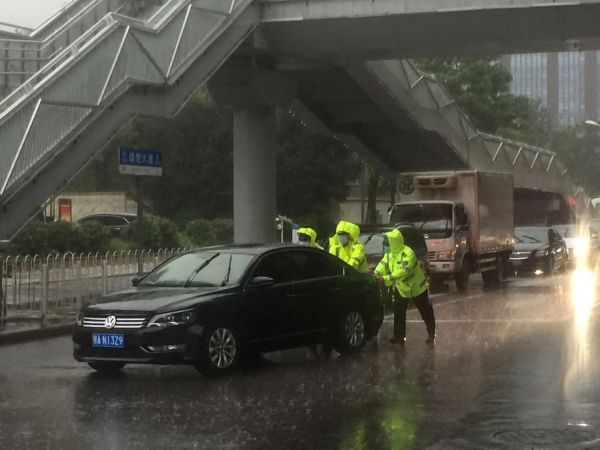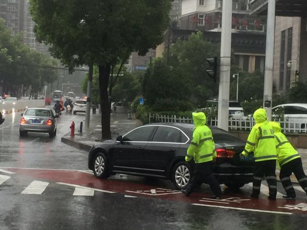 长江网7月6日讯(记者夏奕 通讯员高梓健)6日上午7时58分,雄楚大道晒湖路口一辆黑色大众轿车突然熄火,占据车道影响通行。发现这一情况后,正在路口指挥的武昌区交通大队四中队中队长熊汉霖立即带领民警喻丰、辅警潘劲杰帮忙推车,将车辆推至不妨碍交通的地方。