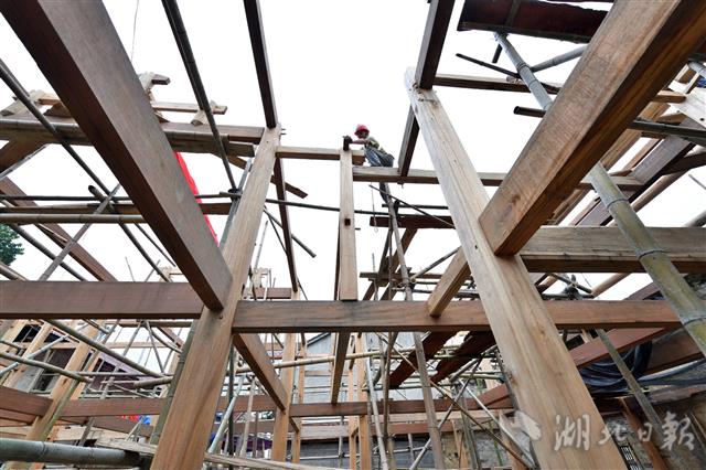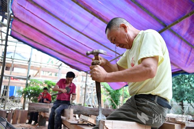 7月4日,工人在保康县店垭镇格栏坪村修缮徐家花屋古民居。保康县店垭镇格栏坪村是一个历史悠久的古村落。今年,当地加大对古民居的保护力度,投入资金进行集中修缮,在此基础上大力发展乡村旅游,让古村落焕发新生,助力乡村振兴。近年来,保康县加大对古民居等文化遗产的保护力度,投入资金对古村落、古建筑进行集中修复,越来越多古民居得到原址保护与活化利用。(视界网 杨韬 陈雪 摄)