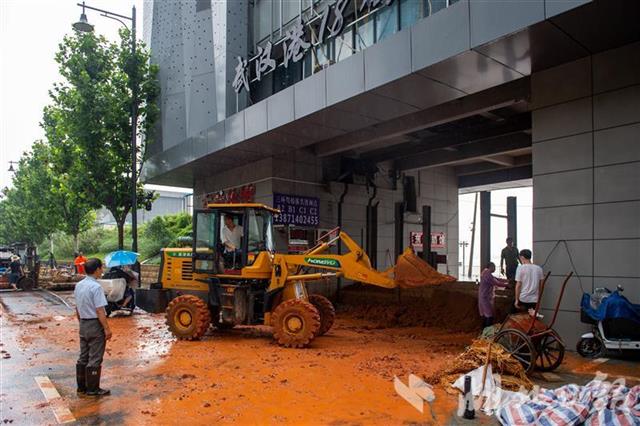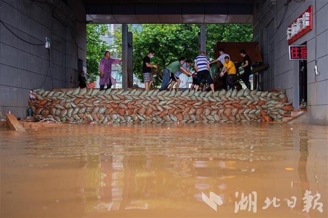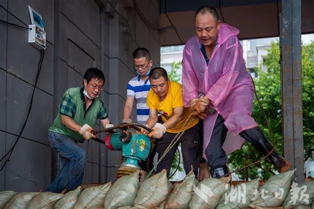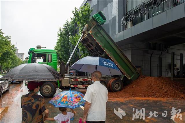 7月6日,武汉市江汉区武汉港18码头,防汛工作人员正在加固闸口封土。当日17时,长江水利委员会官网实时数据显示,汉口武汉关水位达27.10米,逼近27.30米警戒水位。随着长江、汉江水位持续上涨,武汉两江四岸堤防沿线的闸口陆续开始封堵,各级防汛责任部门安排专人24小时上堤巡查防守,确保安全度汛。(湖北日报全媒记者 蔡俊 摄)