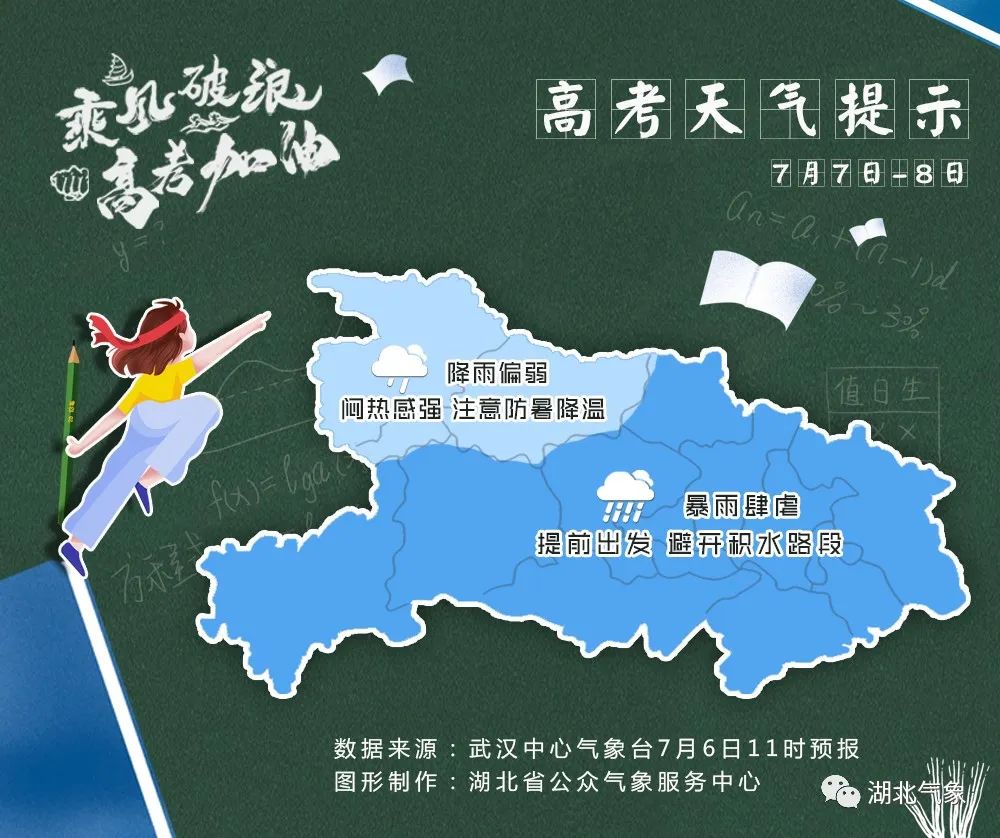 明天是高考首日,提醒武汉及湖北东部地区的考生:注意防范7~8日强降雨天气对高考和交通出行带来的不利影响,考生和家长一定要及时关注最新天气预报预警信息及交通信息,提前规划出行路线,为去往考场留出充裕时间,以免耽误考试。
