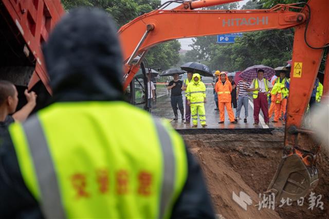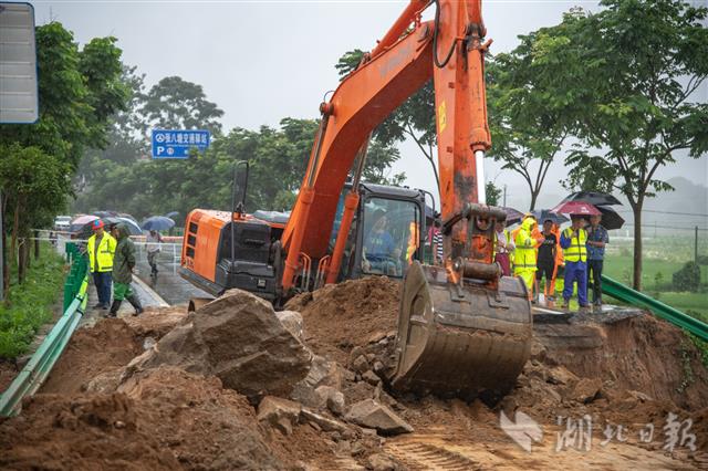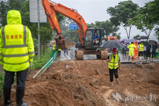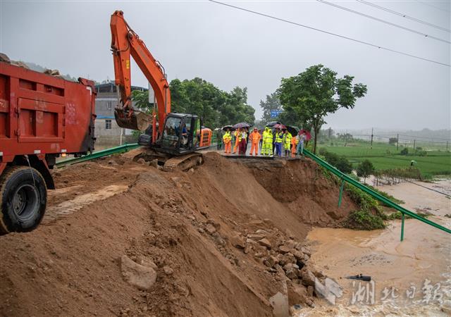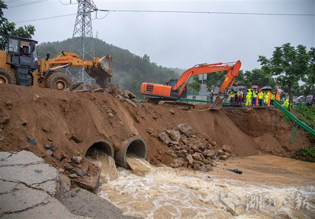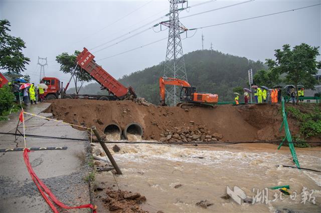 7月6日早上,洪水致318国道罗田县张八塘路段道路被洪水冲毁被冲毁,交通中断。当日下午5时15分许,经过交通应急救援人员的紧急抢修,被毁路段恢复通车。7月4日起,罗田县遭遇连续性强降雨。(湖北日报全媒记者 魏铼 通讯员 刘世民 摄)