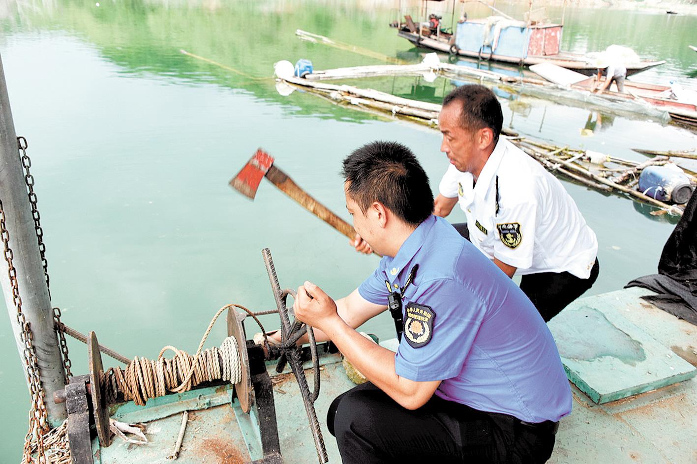 6月28日,十堰市郧阳区联合执法人员正在汉江中段清除筏钓船。6月26日至7月1日,该区开展禁渔行动,海事、渔政、公安、城管等部门组成40多人的联合执法队,在6天的连续作战中,共在汉江查处扣押筏钓房17座、筏钓平台23座、三无船舶11艘、库汊内偷养网箱3个。扣押的非法捕捞设施正在逐步销毁。