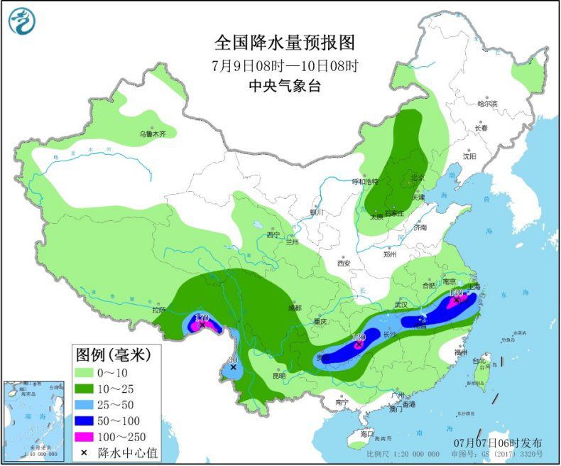 7月7日至9日,受低空切变线影响,西南地区东部至长江中下游地区有强降水天气,主雨带逐步南压至长江沿江及以南地区,重庆、贵州、江汉、江淮、江南北部等地的部分地区有暴雨到大暴雨,局地特大暴雨。
