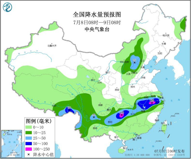 图1 全国强降雨落区预报图(7月7日08时-7月8日08时)