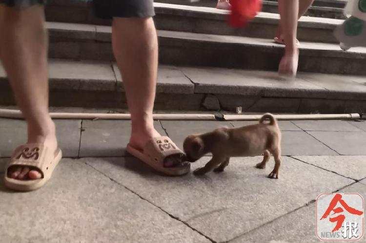 在金沙角亲水平台上,没有拴上束犬绳,对过往市民的脚嗅来嗅去的巴哥犬。