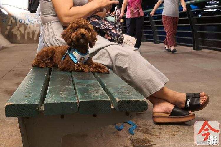 文惠桥底的亲水步道上,拴了束犬绳却没人牵领的贵宾犬。今报记者钟华 摄