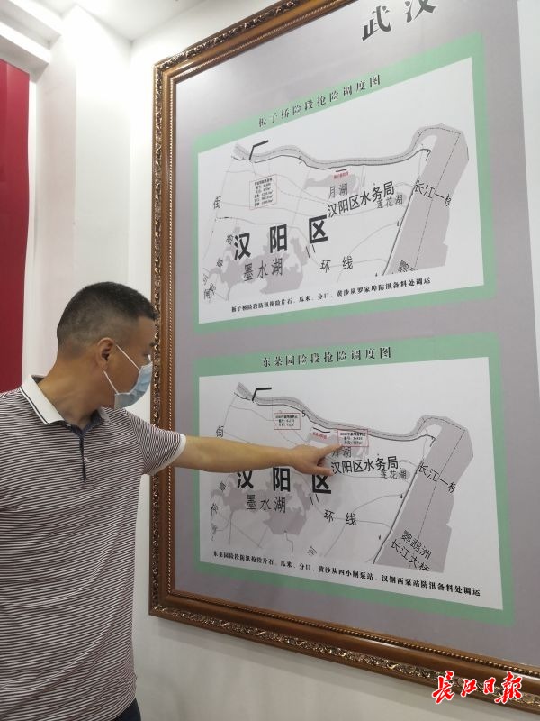 汉阳区环城河道堤防维修管理所相关负责人介绍东菜园险段防汛物料位置。见习记者常丽华 摄