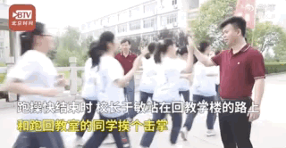 跑操快结束时校长于敏站在回教学楼的路上和跑回教室的同学挨个击掌?️