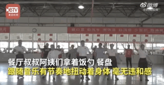 餐厅叔叔阿姨们拿着饭勺餐盘跟随音乐舞蹈毫无违和感!