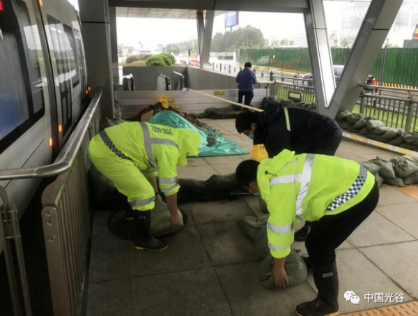光谷交通公司工作人员为有轨电车站台做好防汛准备