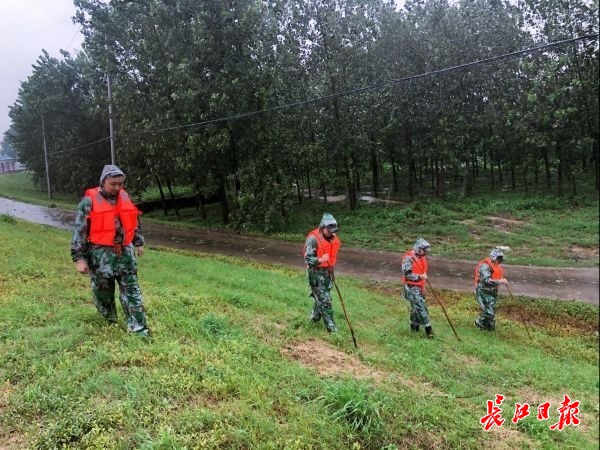 记者注意到,所有巡堤人都“全副武装”,除了雨衣套鞋,还穿着救生衣,每个人手上都拿着一根长竿。“别看工具简单,作用可不小。”巡堤人任翔解释,雨天斜坡湿滑,路面多现坑洼,草丛中还有蛇出没,长竿具有防滑、探路、驱蛇三重功效。
