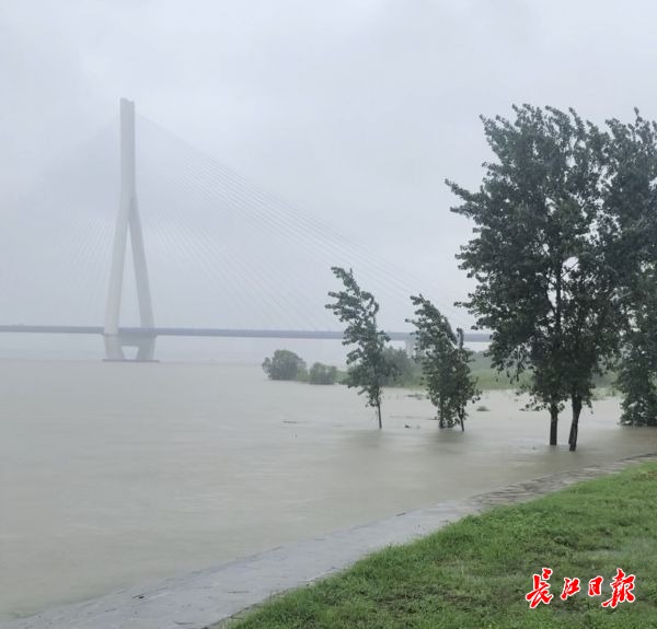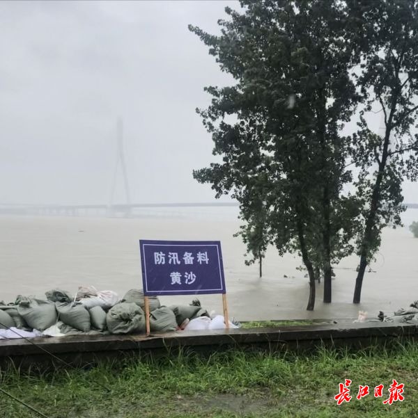 记者在武金堤杨泗矶段看到,江水上涨明显,原来的浅滩已被江水完全淹没,部分防浪林的树只能看见树梢。据了解,杨泗矶段全长大约500米,因此处无外滩,冮水直接冲击大堤,过去曾发生多处管涌险情,是挂号国家防总的险段。