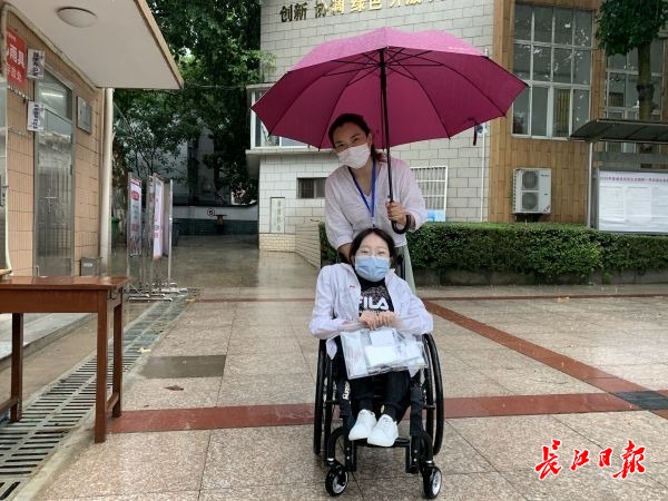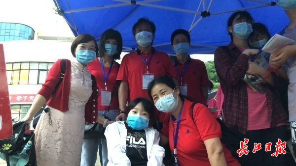 武汉市第十四中考点工作人员更是为该考生考虑得细致周到。该考点具有“最美志愿者”称号的杨戈砂为关淑婧“护航”,一对一进行照顾,推她进入考室,帮助如厕,为她做心理按摩,让孩子沉着应考。