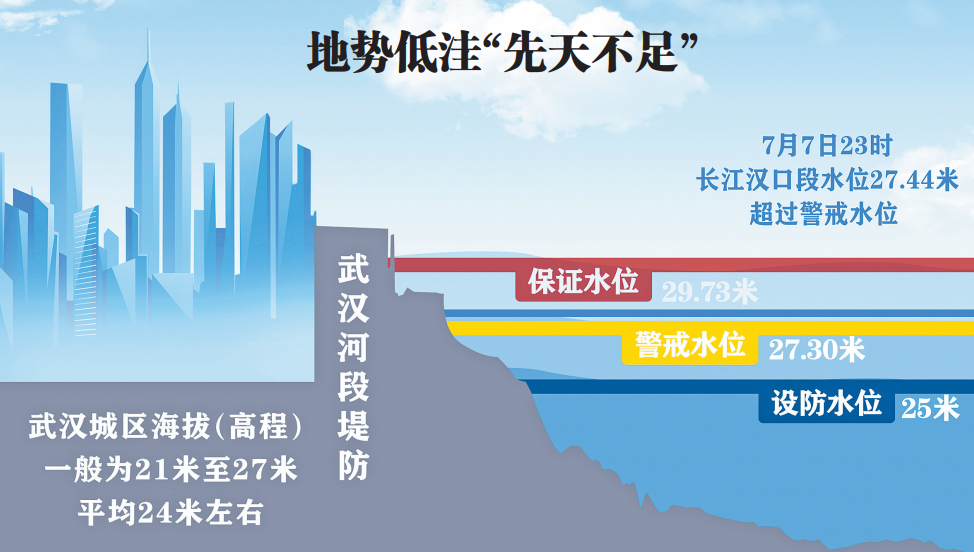 武汉市水务科学研究院院长王怀清表示,武汉的防洪压力源于自身地势较低这一“先天不足”。除少数山丘和湖塘外,武汉市区的一般地面高程为21米至27米,平均地面高程为24米,自有记录以来长江武汉关多年平均最高洪水水位为25.56米,高出地面1.56米。也就是说,到了汛期,如无堤防,江水会直接淹没城区。
