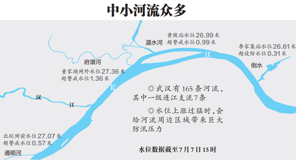 武汉有165条河流,其中一级连江支流7条。这些河流作为武汉防洪体系的重要影响因素,水位上涨过猛时,会给河流周边区域带来巨大的防汛压力。在近年的防洪历史中,举水河就曾出现过一天之间跳涨7米的险象。