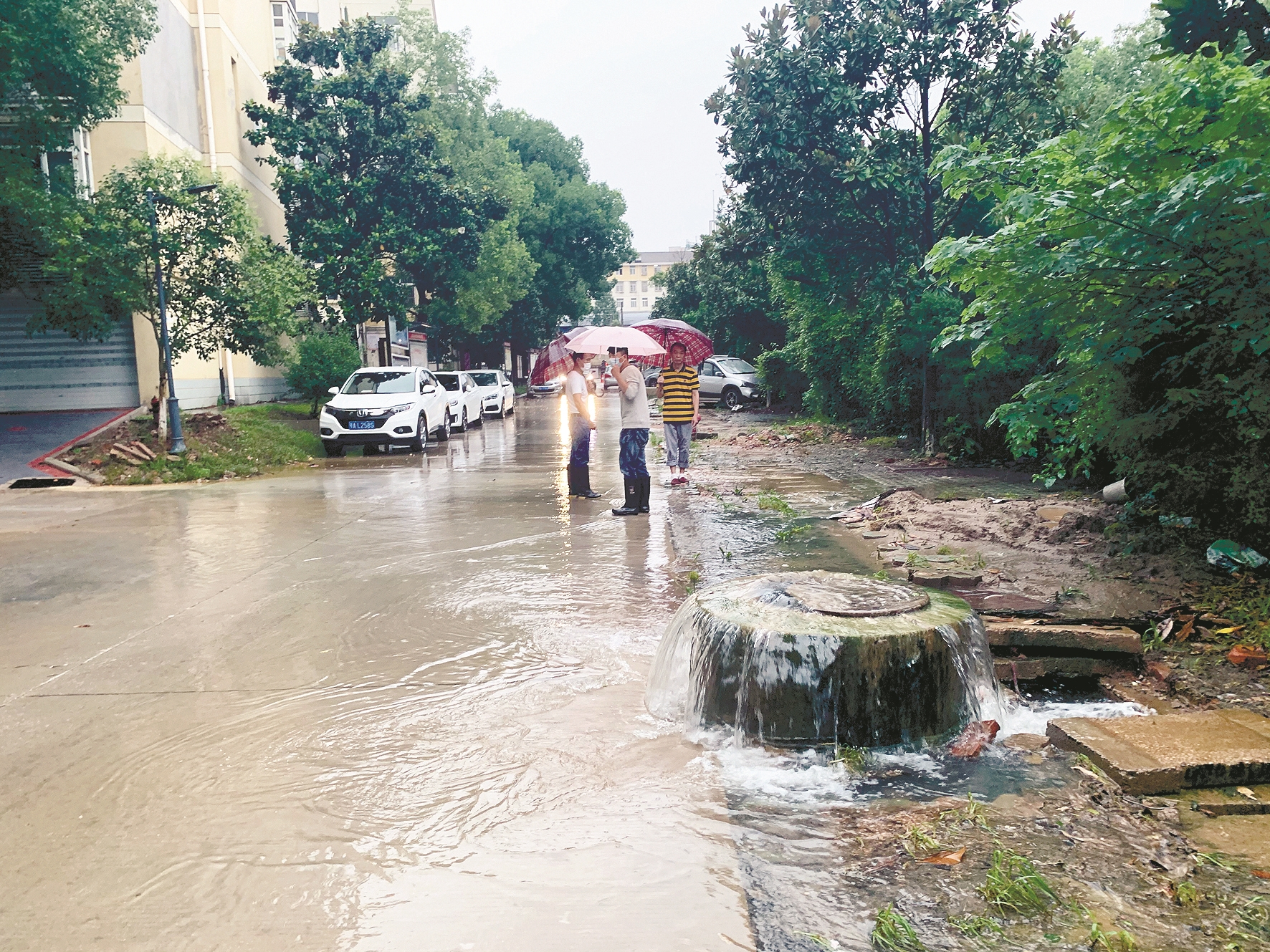 据南波湾高尚小区服务中心主管叶先生反映,2017年初开始,一到下雨天,小区内的污水井就往外冒污水,淹没进出小区的道路。他们向水务部门反映后,有人把污水井修高了一些。但治标不治本,一旦雨量稍大,污水还是会漫溢。今年梅雨期,武汉连续遭遇大到暴雨,污水井和下水管道的污水源源不断地冒出地面,居民通行不便。即使雨停了,污水退去,路面还是会留下黑色污渍,发出难闻的气味,住在附近的居民意见很大。