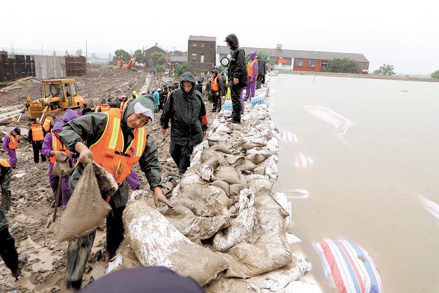 7月7日,仙桃市大垸子泵站,防汛人员正在抢筑通顺河子堤。连日来,仙桃市遭遇多轮强降雨过程,致使沙湖、杨林尾、张沟等15个镇办出现严重渍涝灾害。面对汛情,全市各镇办及水务、消防、公安、应急等部门干部职工奔赴一线,开展排涝救灾抢险工作。 (视界网 刘贤双 摄)