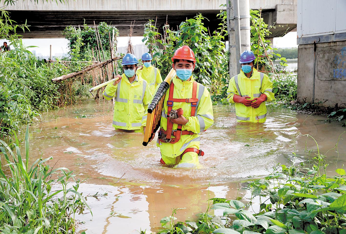 7月7日,国网鄂州市华容区供电公司党员服务队员冒雨涉水抢修10千伏电商壹回线。近日,鄂州市连降暴雨,华容城乡16处内涝渍水,国网鄂州市华容区供电公司7支党员服务队日夜奋战在防汛排涝和居民用电保障一线。 (湖北日报全媒记者 张鸿 通讯员 姜志刚 郑瑶 摄)