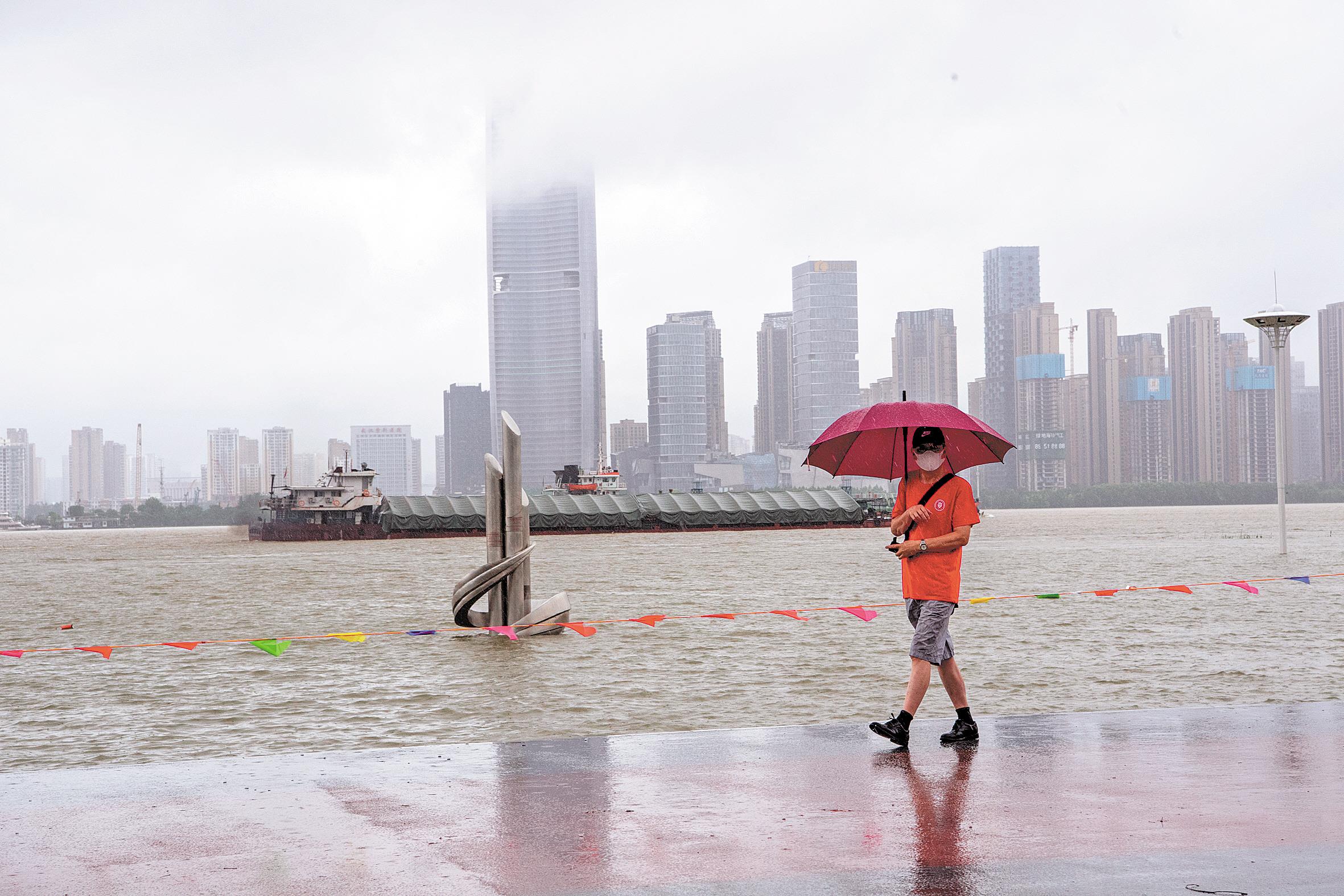 7月7日,武汉市区普降暴雨,图为市民在汉口江滩。当天早晨7时,长江汉口水文站水位27.3米,达到武汉市防洪警戒水位。 (湖北日报全媒记者 陈勇 摄)