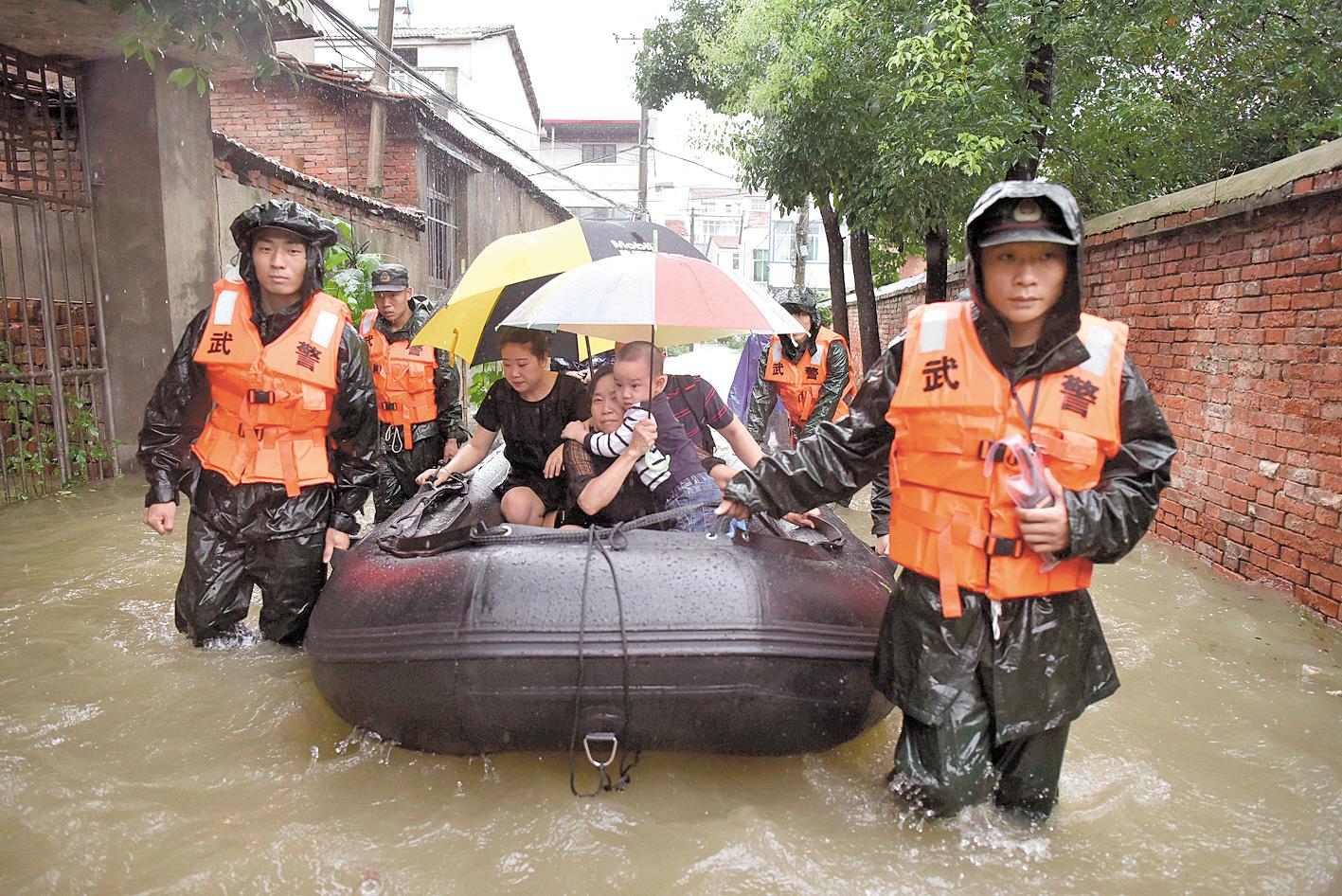 7月7日13时05分,黄冈市黄州区禹王社区发生城区内涝,50余名社区群众被困。接到命令后,武警湖北总队黄冈支队机动中队出动15名官兵,携带救生衣、救生圈等,使用皮划艇紧急转移受困人员和物资。(视界网 谢定安 摄)