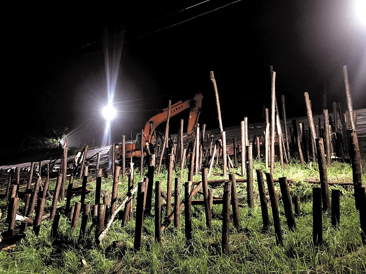 “咚咚——”水库右坝肩上,打桩声此起彼伏。操作手精准操控,挖掘机变身大锤,将一根根半米长木桩打入坝坡。成百上千根木桩如士兵列阵,牢牢守住险情地带。