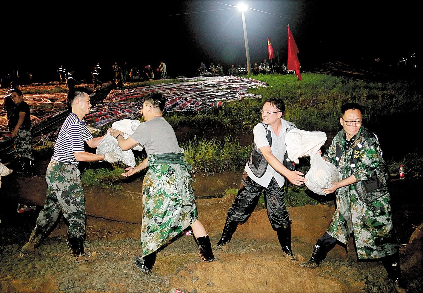 “快!”“快!”“加快速度!”夜色下,深一脚、浅一脚地踩着稀泥,一队队干部群众赶往堤坝。