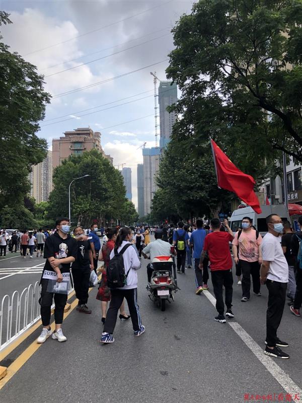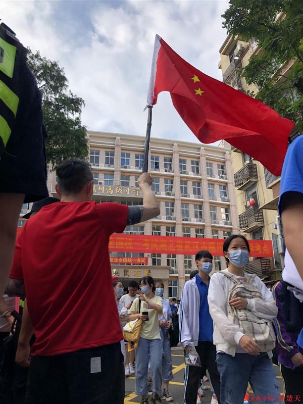 楚天都市报7月8日讯(记者向一帆)“每个人心中都该有一面国旗!”7月8日,在汉阳区晴川中学考点,伴随着高考最后一场考试的结束铃声,考生家长孙国辉将早已准备好的国旗挥舞起来,等待女儿考试归来,同时也为其他考生加油鼓劲。
