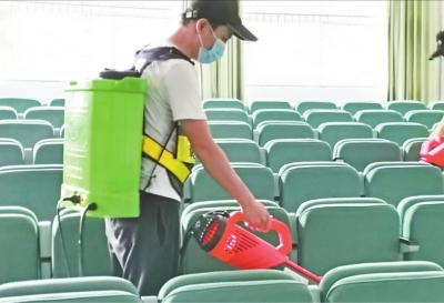 高考结束后,武汉市第十七中学考点,专业消杀队对各个考场、候考区、办公区进行全面消杀。记者向洁 摄