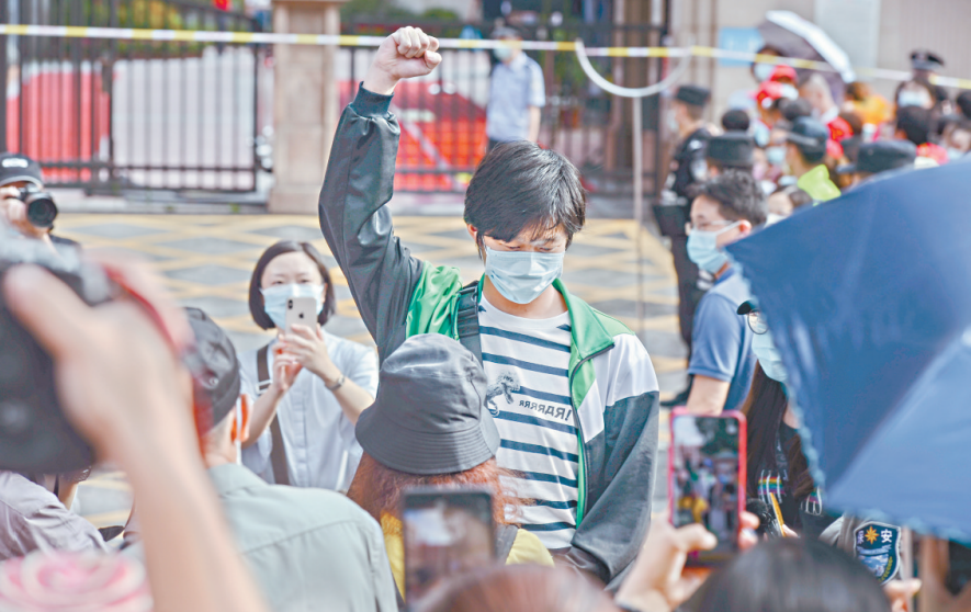 8日下午,武汉二中考点外,第一位走出考场的考生高举拳头,庆祝高考结束。