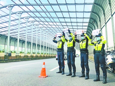 8日下午2时45分,喻家湖高架、雄楚高架上,交警手举标语示意过往车辆禁鸣缓行,为考生英语听力考试“降噪”。