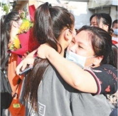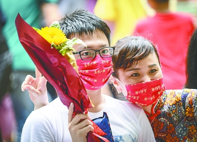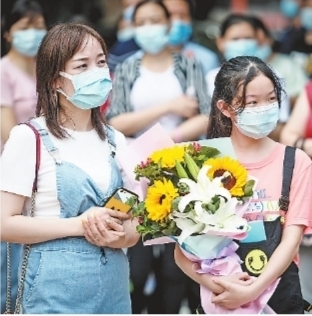 在武汉市第二职业教育中心考场外,家长用鲜花和拥抱迎接孩子们。