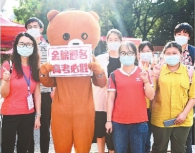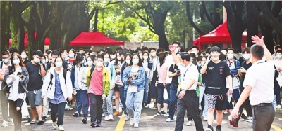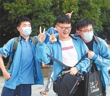 考试结束,考生们在考场外欢快留影。