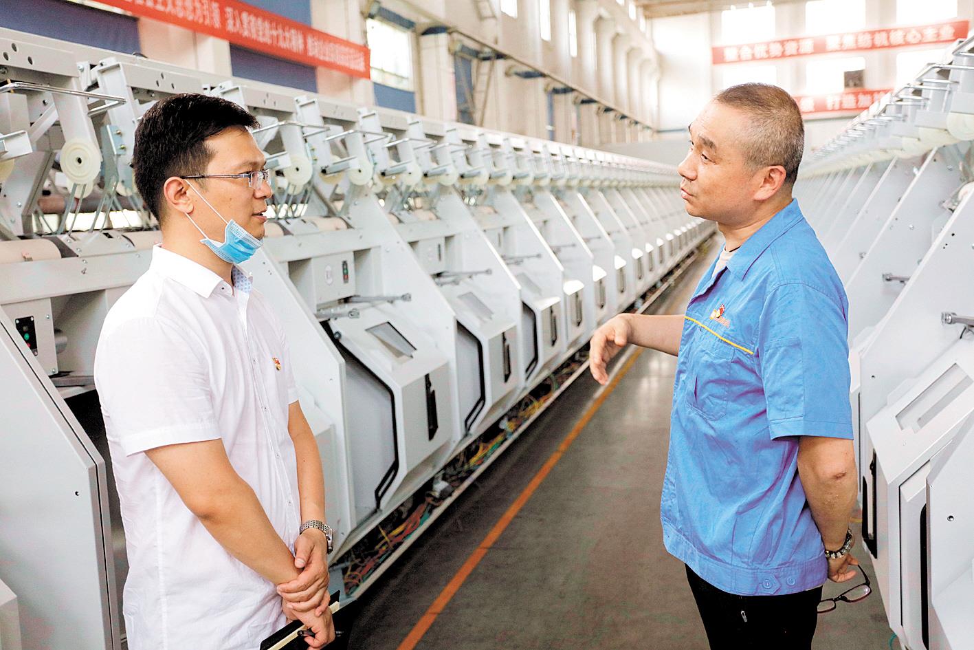 7月8日,宜昌市伍家岗区科技经信局党员干部(左)在宜昌经纬纺机有限公司车间了解相关生产经营情况。截至7月8日,伍家岗区“百名干部进百企”领导小组办公室共收集111家企业反映的130个问题,已办结122个,累计为58家企业融资70.44亿元,为80家企业解决用工1975人。
