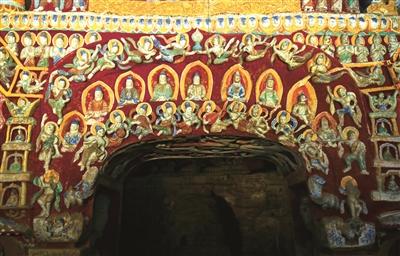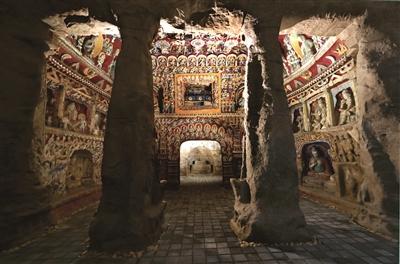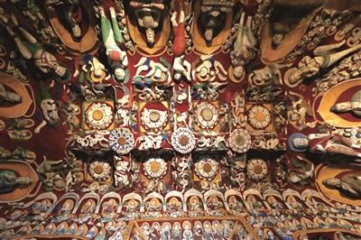 云冈石窟研究院美术工作团队依照古法用矿物颜料为面积大约900多平方米的复制窟上色,历经8个月的时间,终于让12窟完成了其形色具足的复制,焕然呈现。