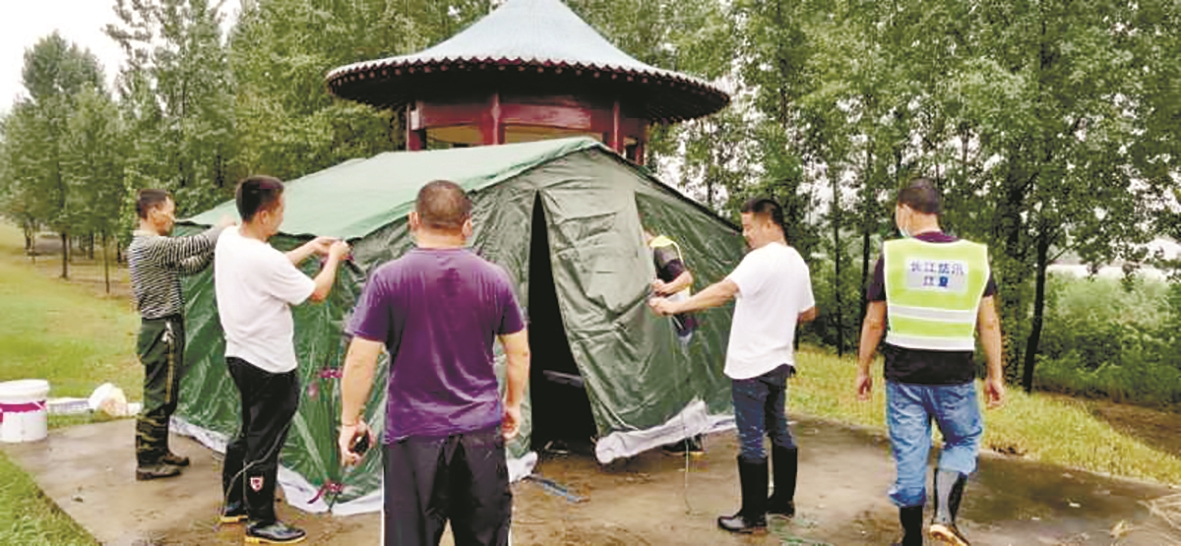 沿途经过长江干堤双窑、居字号、中湾、红灯、谭家窑、致富等6个险段。每隔一段距离就有身穿“长江防汛江夏”的工作人员在搭建帐篷。
