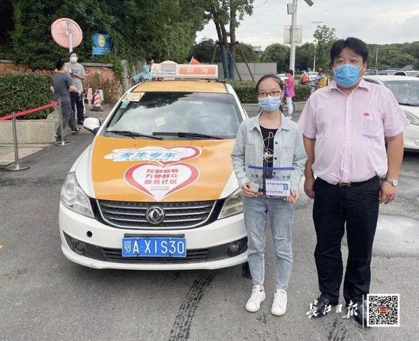高考期间,武汉平均每天有近2.6万多辆巡游出租车和网约车通过线上线下开展运营,为高考学子保驾护航。图为的士司机喻师傅和考生合影。