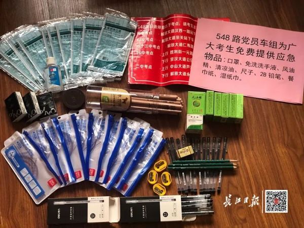 公交548路司机甘勇自费在车上配备了2B铅笔、圆珠笔、尺子和橡皮擦等10套全新文具,还有口罩、干湿纸巾和风油精等物品,乘车的高考考生都可免费领用。车窗玻璃上,他还贴心地贴上了线路途经的5个考点下车站点以及“高考加油”等宣传标语。