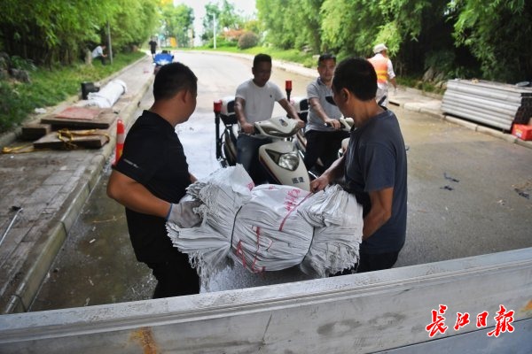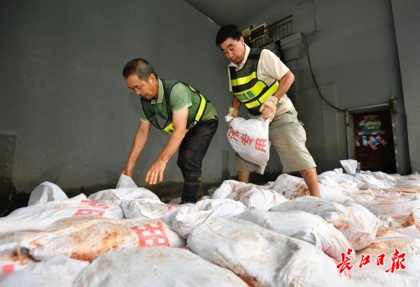 武汉碧水集团工作人员正在运送沙袋等防汛物资。 记者苗剑 摄