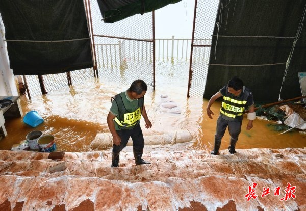 武汉港18码头附近,防汛值守人员在钢闸门外加垒挡水沙袋。 记者郭良朔 摄