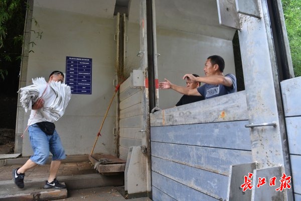 7月9日中午,青山江滩建三闸口已完成封闭,武汉碧水集团工作人员正在忙着运送沙袋等防汛物资,以备不时之需。 记者苗剑 摄