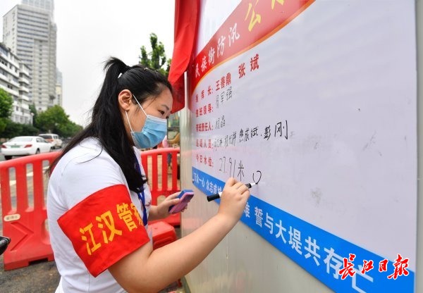 长江民权街防汛值守点,工作人员及时更新水位高度。 记者郭良朔 摄