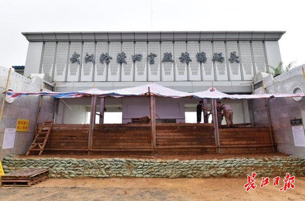 轮渡四官殿码头外,已经垒起半米沙袋和并抢筑起近两米高的闸条。 记者郭良朔 摄