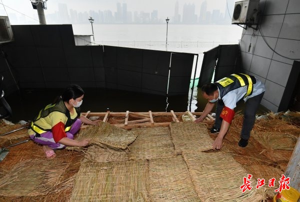 武汉港18码头,防汛值守人员加铺干草垫。 记者郭良朔 摄