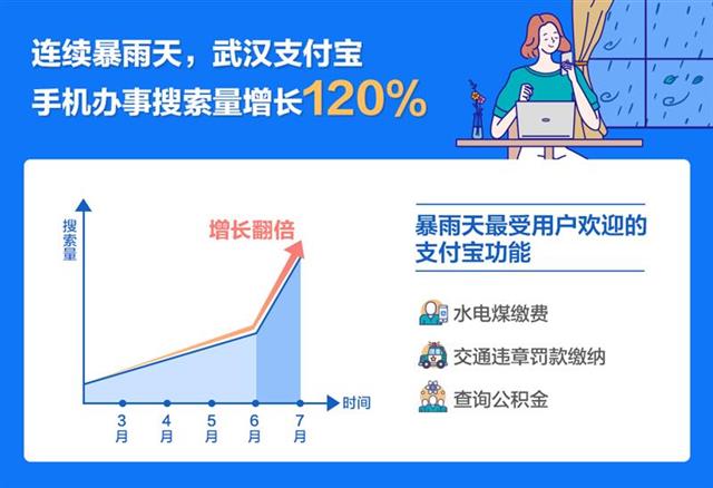 楚天都市报7月9日讯(记者周丹)近日,武汉持续暴雨,许多要出门办事的人都心中打鼓,出门怕淋雨,不出门又怕耽误事儿。事实上,武汉人手机办事已经很方便。据支付宝数据显示,这些天包括生活缴费、违章缴罚、公积金查询、等功能的搜索量增长120%。
