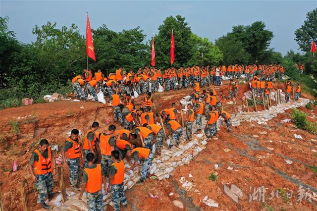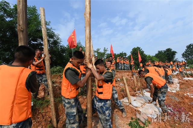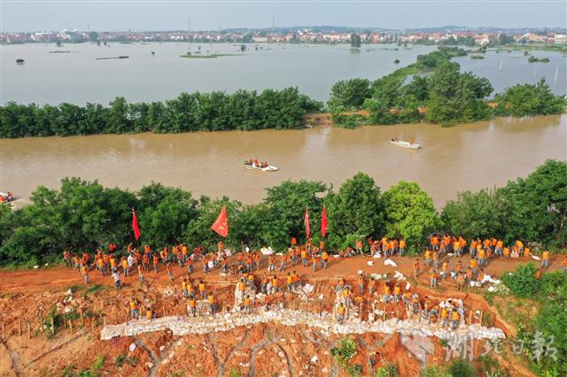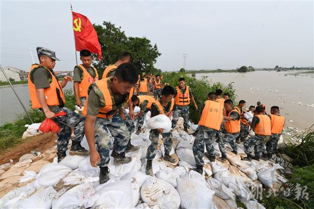2020年7月9日,驻鄂空降兵某旅青年突击队在黄梅县濯港镇桂坝村填堵考田河溃堤。