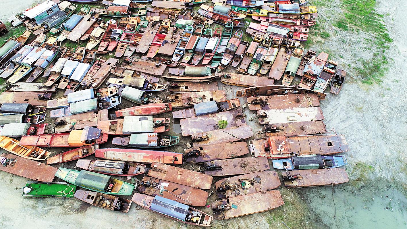 7月7日,襄阳市樊城张王岗村汉江边的滩涂上,管理员在封存上岸的船只。襄阳市在汉江流经襄阳的195公里水岸线,划分了37个巡段,沿江公安机关全警出动,进行拉网式巡逻,开展河道清理。截至当日,襄阳市禁渔水域有证渔船1114艘已全部上岸,初步排查到的2290艘“三无”船舶也已全部上岸。(视界网 王虎 摄)