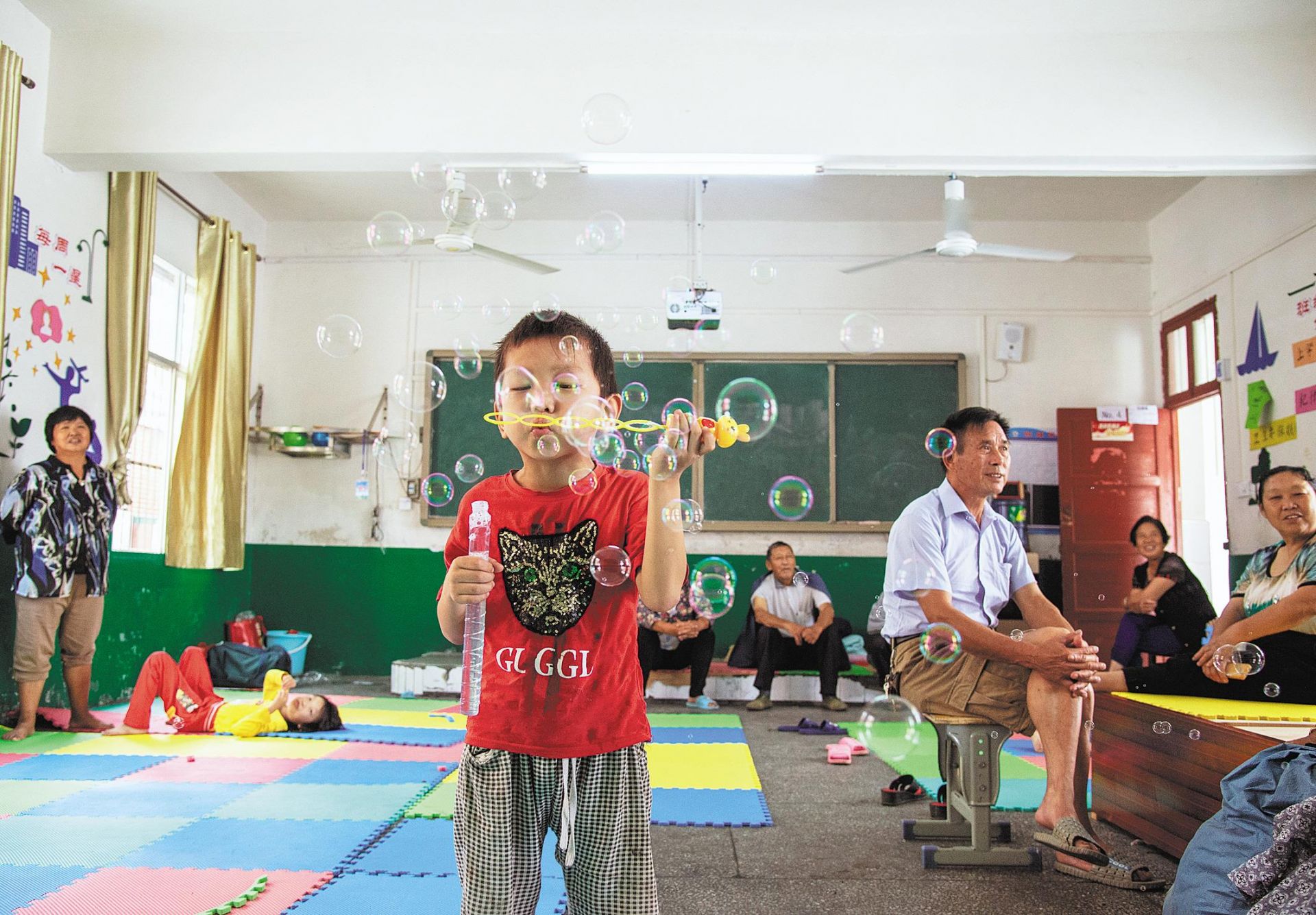 7月9日,武穴市花桥小学临时安置点,受灾群众在教室里乘凉,一个小男孩在吹泡泡。