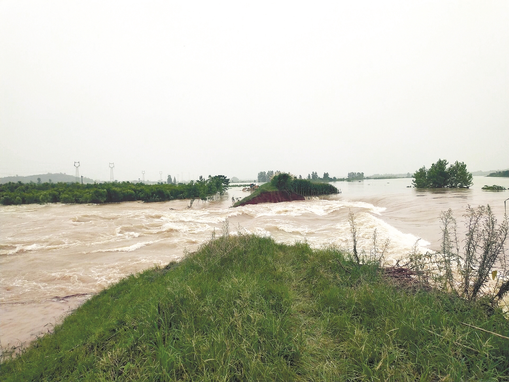 站在溃口处,记者明显感受到脚下的河堤在颤抖,溃口旁边坝堤上的泥土,被湍急的河水冲走。一片玉米地,浸泡在水中只露出一点禾苗。在溃口对面,一辆救援的铲车已浸泡在了水中。