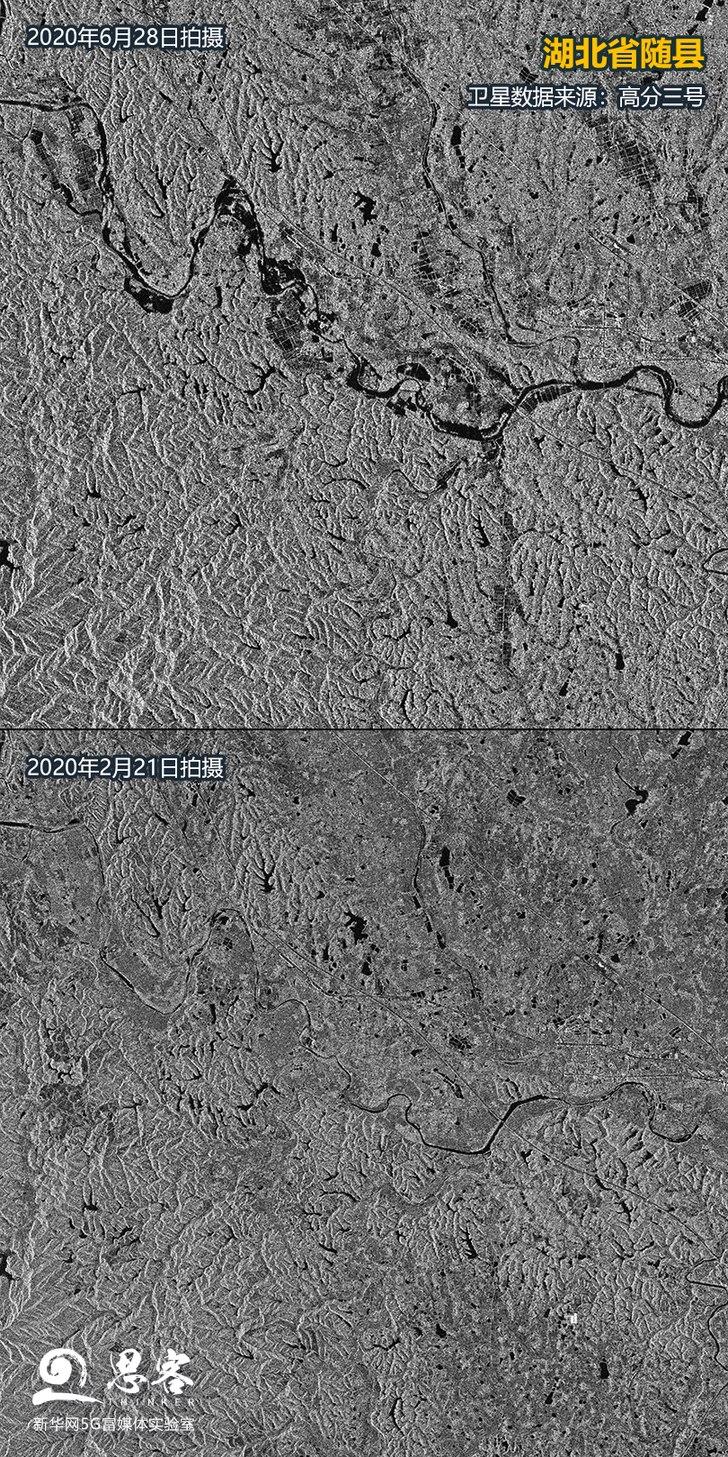 ▲雷达卫星影像下的湖北随县,与2月份水位(下图)对比,6月28日(上图)受暴雨影响内涝严重。