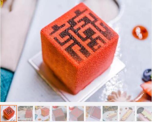 “如意糕”,以“乾隆御题如意”的端首为主体造型,表面浅浮雕两条水中跳跃的鲶鱼,谐音“年年有余”,口味有浓情摩卡、黑巧奶酪……也很适合年轻人的口味。